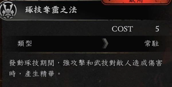 「琢技夺灵之法」,它是被动技能,触发条件是当你发动琢技并击中敌人的时候可以吸收精华,搭配「吸收精华可回复体力」的词条就可以边打边回血。