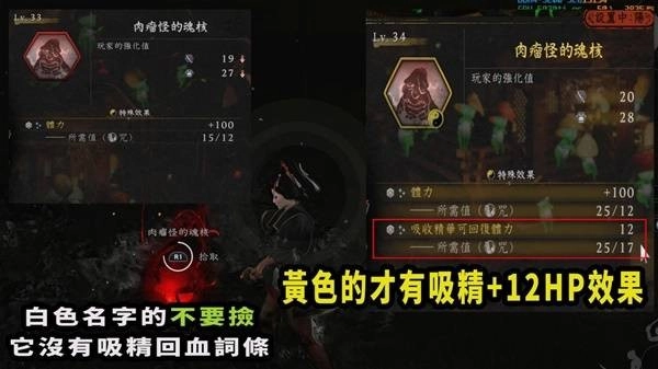 要是遇到白色的就别捡,直接点击「返回标题画面」,之后就能回来重新挑战,一直打到出现「黄色名称的肉瘤怪」就可以了。